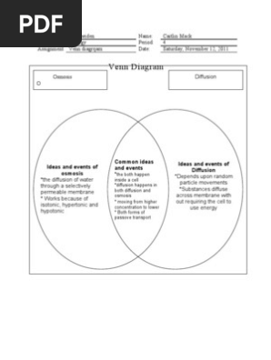 Diffusion also most commonly occurs between gas molecules, although it may also occur between solids and liquids or between liquids and gases. Osmosis on the other hand only occurs between two solvents. Osmosis also takes much less time to occur than diffusion. A Venn Diagram showing Diffusion, Osmosis and Active Transport. DIFFUSION OSMOSIS ACTIVE TRANSPORT Involves water only How oxygen leaves a leaf Is passive High to low concentration How water keeps plant cells turgid ... Nov 2, osmosis-and-diffusion-venn-diagram. Ven diagram of osmosis vs diffusion. Diffusion and osmosis are both passive transport processes. Aug 18, Students place comments into the correct sections of a Venn diagram.Diffusion Osmosis Diffusion is a type of passive transport. Diffusion is the movement of any liquid or gas from an area of high ... Create A Venn Diagram Comparing Osmosis And Diffusion - Osmosis And Diffusion Venn Diagram - General Wiring Diagram - One side contains a mixture .. This concept is crucial for anyone who wants to . Conclusion 1 create a venn diagram comparing osmosis and diffusion 2. By a rigid covering, causing pressure to build up within cells.