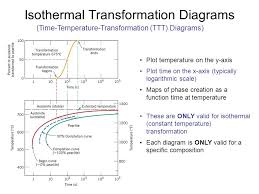 Isothermal transformation diagrams (also known as time-temperature-transformation (TTT) diagrams) are plots of temperature versus time (usually on a logarithmic scale).They are generated from percentage transformation-vs time measurements, and are useful for understanding the transformations of an alloy steel at elevated temperatures.. An isothermal transformation diagram is only valid for one ...