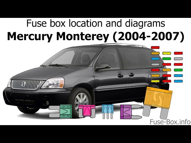 Mercury Monterey (2004-2007) fuses and relays. Advertisements. The minivan Mercury Monterey was produced from 2004 to 2007. Here you will find fuse box diagrams of Mercury Monterey 2004, 2005, 2006 and 2007, get information about the location of the fuse panels inside the car, and learn about the assignment of each fuse (fuse layout) and relay.