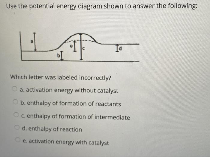 Potential Energy Diagram Worksheet ANSWERS 1. Which of the letters a-f in the diagram represents the potential ... Draw an energy diagram for a reaction. Label the axis, PE of reactants = 350 KJ/mol, Ea = 100 KJ/mol, PE of products = 250 KJ/mol. 7. Is the reaction in # 6 exothermic or endothermic?
