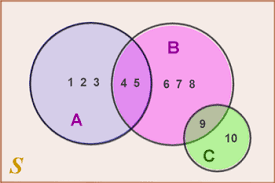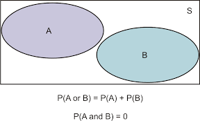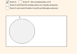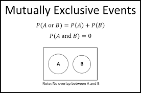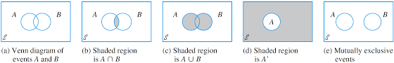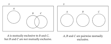 Logical Relationships among Sets Mutually exclusive (disjoint): refers to two (or more) events that cannot both occur when the random experiment is formed. A∩B=Ø Exhaustive: refers to event(s) that comprise the sample space. A∪B=𝕌 Partition: events that are both mutually exclusive and exhaustive. A∩B=Ø and A∪B=𝕌. ⛲ Example 1. All the clubs are taken out of a pack of card Venn diagrams and the addition rule for probability. Venn diagrams and the addition rule for probability. ... And these type of conditions, or these two events, are called mutually exclusive. So if events are mutually exclusive, that means that they both cannot happen at the same time. There's no event that meets both of these conditions. Let's draw some Venn diagrams to better understand the concept of mutually exclusive events. Let's suppose we have two events A and B. We know that an event is the subset of a sample space, so we draw the Venn diagram for event A as follows: It follows that mutually exclusive events are those that do not share any of the same outcomes. How do we calculate the probability of these events? Let us visualize using a Venn Diagram: If \( A \) and \( B \) are two mutually exclusive events, then the probability of \(A \) or \( B \) occurring is their respective probabilities added together.