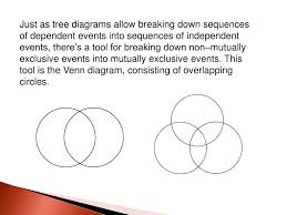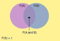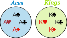 A two-event Venn diagram describes the relationship between two events in the following ways: If the two events are mutually exclusive, then the circles representing each event do not overlap. If the two events are not mutually exclusive, then the two circles overlap. The overlapping region represents the intersection of the two events. Thus, A and B are mutually exclusive events. On the other hand, if we wanted to know the probability of selecting an ace or a king, P(A ∪ B), we would simply sum their individual probabilities: P(A ∩ B) = P(A) + P(B) 1/13 + 1/13 = 2/13. Venn diagrams. Mutually exclusive events can be depicted using Venn diagrams.