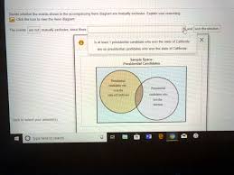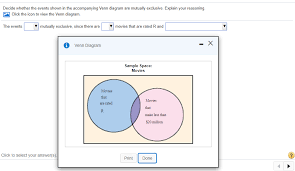 In a Venn diagram the squared area denoted e contains all possible events. The circles represent specific events. Probabilities are represented by the ratios of areas. For example, the probability of event A in the figure below is the ratio of area A to the total area e: Figure 1: Venn diagram for a single event A. Mutually Exclusive Events The following Venn diagram represents mutually exclusive (disjoint) sets. If the union of two mutually exclusive sets is the universal set they are called complementary. The intersection of two complementary sets is the null set, and the union is the universal set, as the following Venn diagram suggests. This probability video tutorial provides a basic introduction into mutually exclusive events with the use of venn diagrams.My Website: https://www.video-tut... 100% (1 rating) SOl: Mutually exclusive events that cannot both occur exclu …. View the full answer. Transcribed image text: Decide whether the events shown in the accompanying Venn diagram are mutually exclusive. Explain your reasoning Click the icon to view the Venn diagram The events are mutually exclusive, since there are movies that are ...