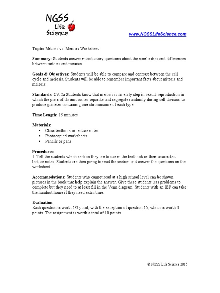 Mitosis and meiosis venn diagram answer key Getting mitosis and meiosis confused on a biology exam can cost a lot of points, so it is important to keep these two cell processes straight. In this guide, it breaks the mitosis against meiosis, explain each of the processes, and establish their similarities and differences so that you will be ...