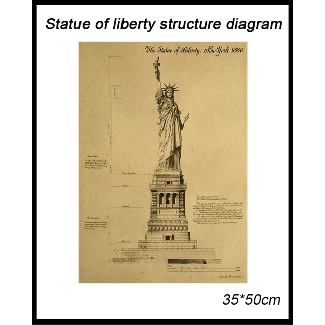 World Famous Design Statue Of Liberty Structure Diagram Vintage Poster Retro Kraft Paper Bar Wall Decor Room Decoration Wall Sticker Painting 50 5 35cm Shopee Malaysia