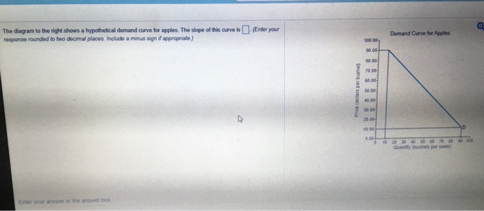 Transcribed image text: (Enter your response The diagram to the right shows a hypothetical demand curve for apples. The slope of this curve is rounded to ...
