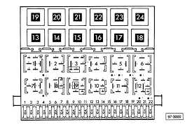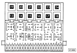 Volkswagen Golf mk3 (1991 – 1997) – fuse box diagram. Year of production: 19991, 1992, 1993, 1994, 1995, 1996, 1997. Fuse layout (from left to right)