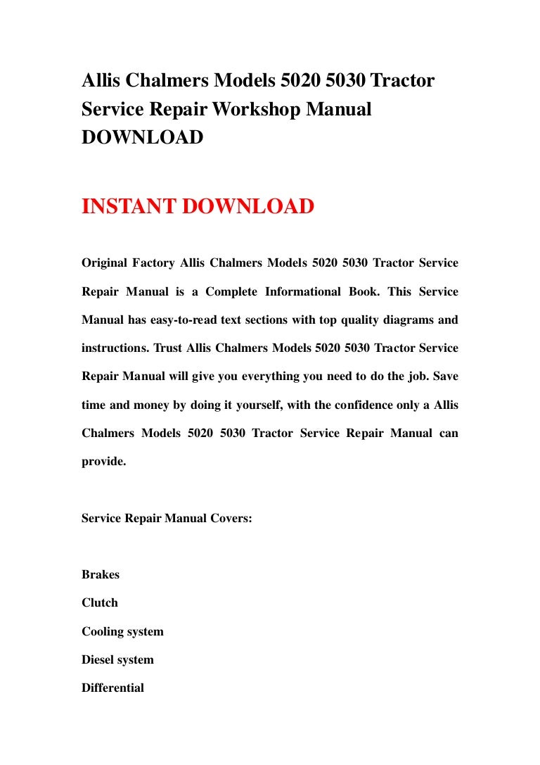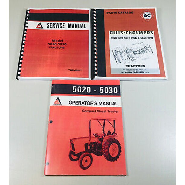2- Allis Chalmers 5020 Tractor Illustrated Parts List Manual Catalog. 3- Allis Chalmers 5020 Tractor Operators Owner Instruction Manual. This Complete Allis Chalmers 5020 tractor workshop manual includes instructions to maintain and service your tractor using diagrams and manufacturers specifications.