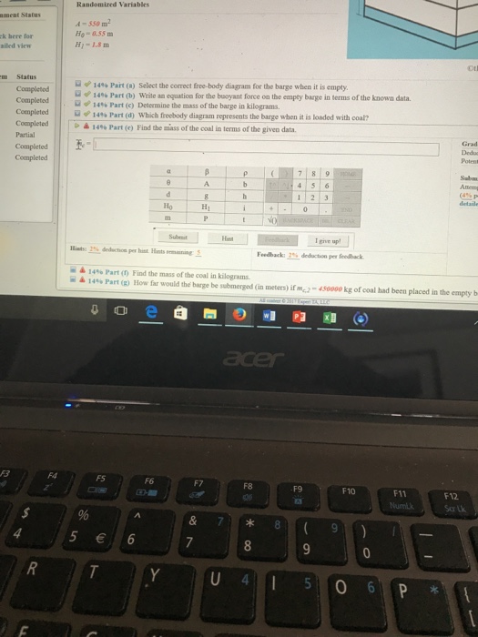When empty the bottom of the barge is located Ho 0.55 m below the surface of the water When fully loaded with coal the bottom of the barge is located Hi-1.4 m below the surface Randomized Variables A= 350 m Ho= 0.55 m H1=1.4m ©theexpertta.com 14% Part (a) Select the correct free-body diagrarm for the barge when it is empty 14% Part(b) Write an ...