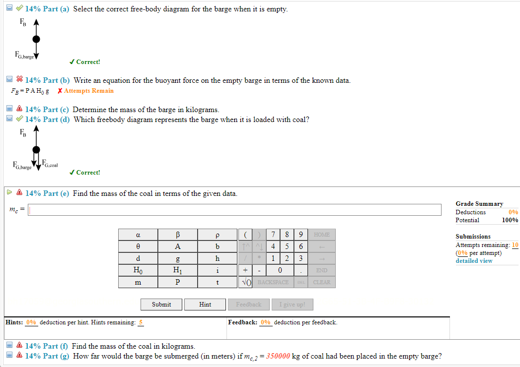 14% Part (d) Which freebody diagram represents the barge when it is loaded with coal? 14% Part (e) Find the mass of the coal in terms of the given data. 14% Part (f) Find the mass of the coal in kilograms. 14% Part (g) How far would the barge be submerged (in meters) if m c,2 = 350000 kg of coal had been placed in the empty barge?