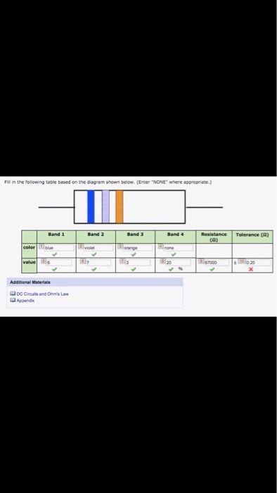 Science. Physics. Physics questions and answers. +9/10 points | Previous Answers Fill in the following table based on the diagram shown below. (Enter "NONE" where appropriate.) Band 1 Band 2 Band 3 Band 4 Resistance (Q) | Tolerance (Ω) color orange gold value 3 %1 32000 Additional Materials DC Circuits and Ohm's Law Appendix. Question: +9/10 ...