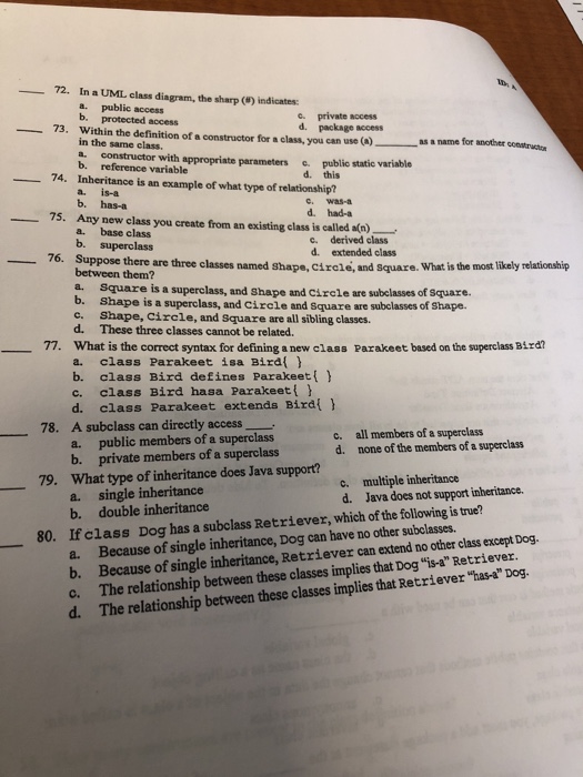 The relationship created with composition is called a(n) ____ relationship. a. is-a c. with-a. b. has-a d. child. 5. A(n) ____ in a class diagram indicates public access. a. minus sign c. plus sign. b. diamond d. exclamation point. 6. A(n) ____ in a class diagram indicates private access. a. minus sign c. exclamation point. b. plus sign d ...