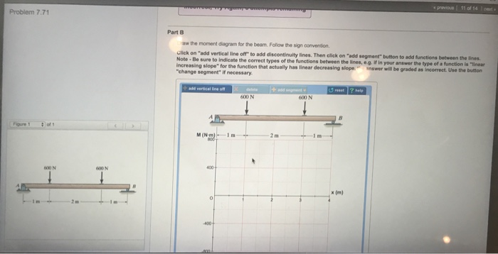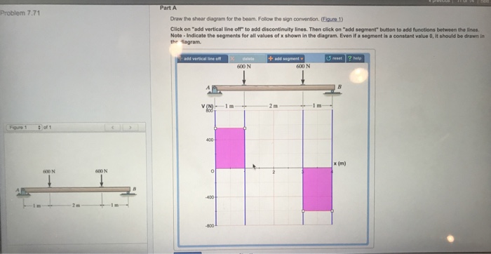 Draw the shear and moment diagrams for the beam shown in the figure. Figure 1 click on add vertical line off to add discontinuity lines. Follow the sign convention. Then click on add segment button to add functions between the note 1 you should not draw an extra discontinuity line at the point where...