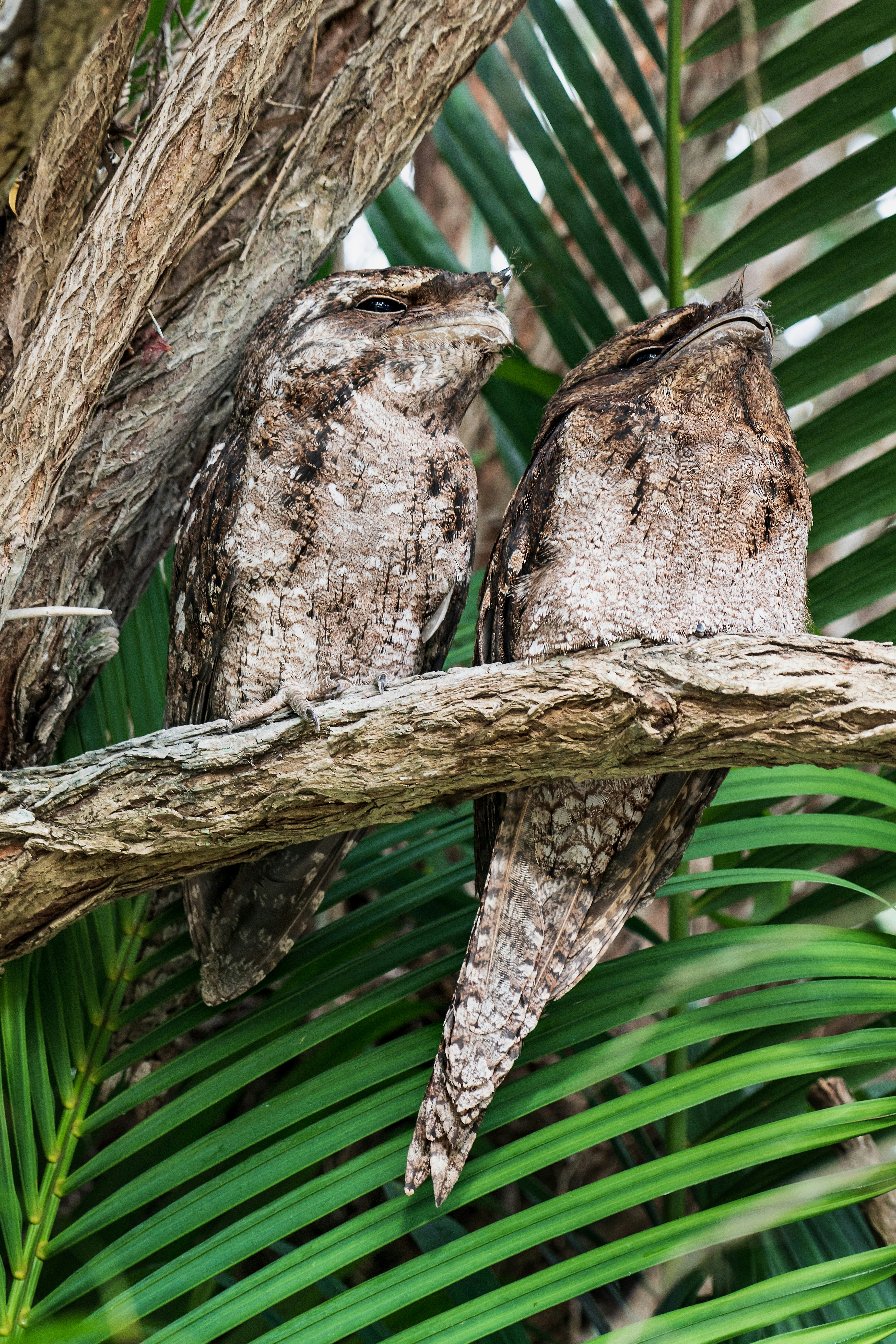 A couple of Papuan Frogmouths which have taken up residence at the Lazy Lizard Motel in Port Douglas, Australia.