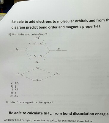Nov 21, 2018 · According to Molecular Orbital theory, only those molecule can exists which have net positive bond order while the molecules with negative or. Answer to For Ne2, construct three molecular orbital diagrams, one each for the neutral molecule, the +1 cation, and the -1 anion. © Prof Adam J Bridgeman | close window. © Prof Adam J Bridgeman | close window.The orbital correlation diagram in predicts the same thing--two electrons fill a single bonding molecular orbital.