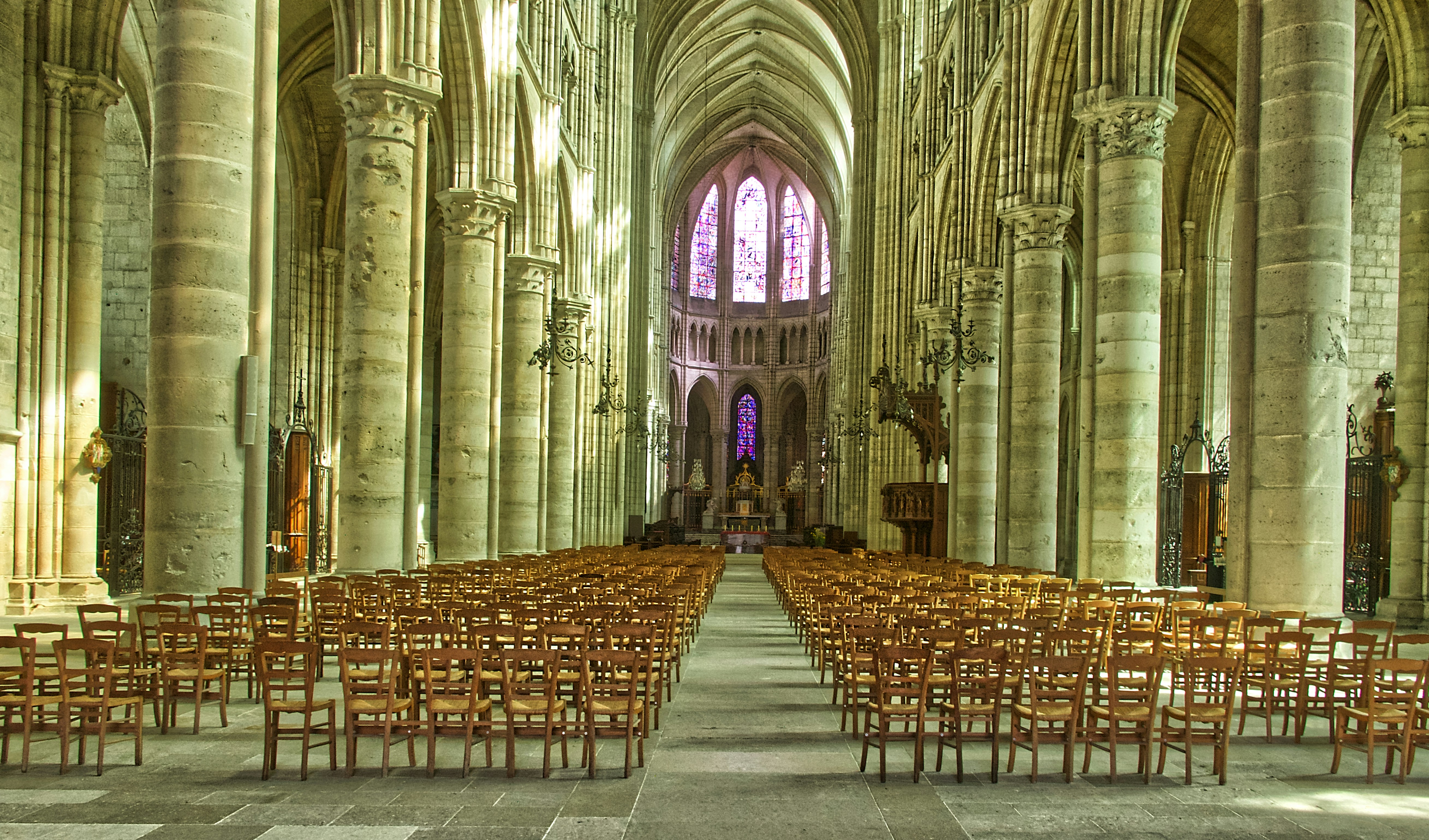 Perspective sur la nef centrale de la basilique-cathédrale Saint-Gervais-et-Saint-Protais Câest une cathédrale catholique romaine de style gothique classique. Elle a été érigée en basilique mineure le 10 mars 1857. La construction de l'actuelle cathédrale de Soissons, la troisième dans l'histoire, commence en 1176 et se poursuit durant trois siècles. La célébration de la dédicace par l'évêque Jean Milet a lieu le 25 avril 1479.