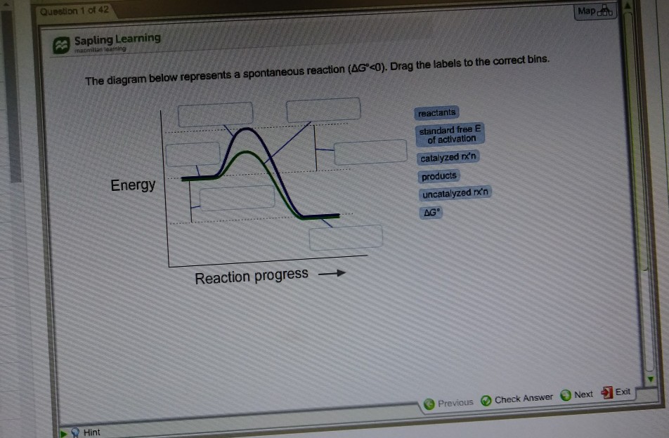 The diagram below represents a spontaneous reaction (deltaG degree < 0). Drag the labels to the correct bins. uncatalyzed rx'n Delta G degree standard free E of activation products reactants catalyzed rx?n. Question: The diagram below represents a spontaneous reaction (deltaG degree < 0).