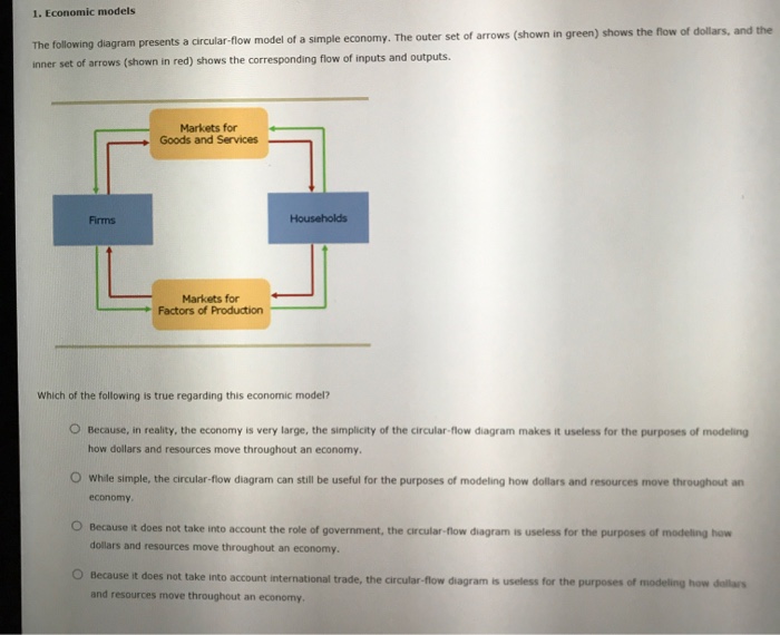 7 Mar 2011 — The firms will then use these factors of production to produce goods and services to be sold in the markets for goods and services. The ... Question: Which is the following is true according to the circular-flow diagram? a. firms receive wages, rent. and profit from the government b. households ... That is the basic form of the model, but actual money flows are more complicated. Economists have added in more factors to better depict complex modern ...