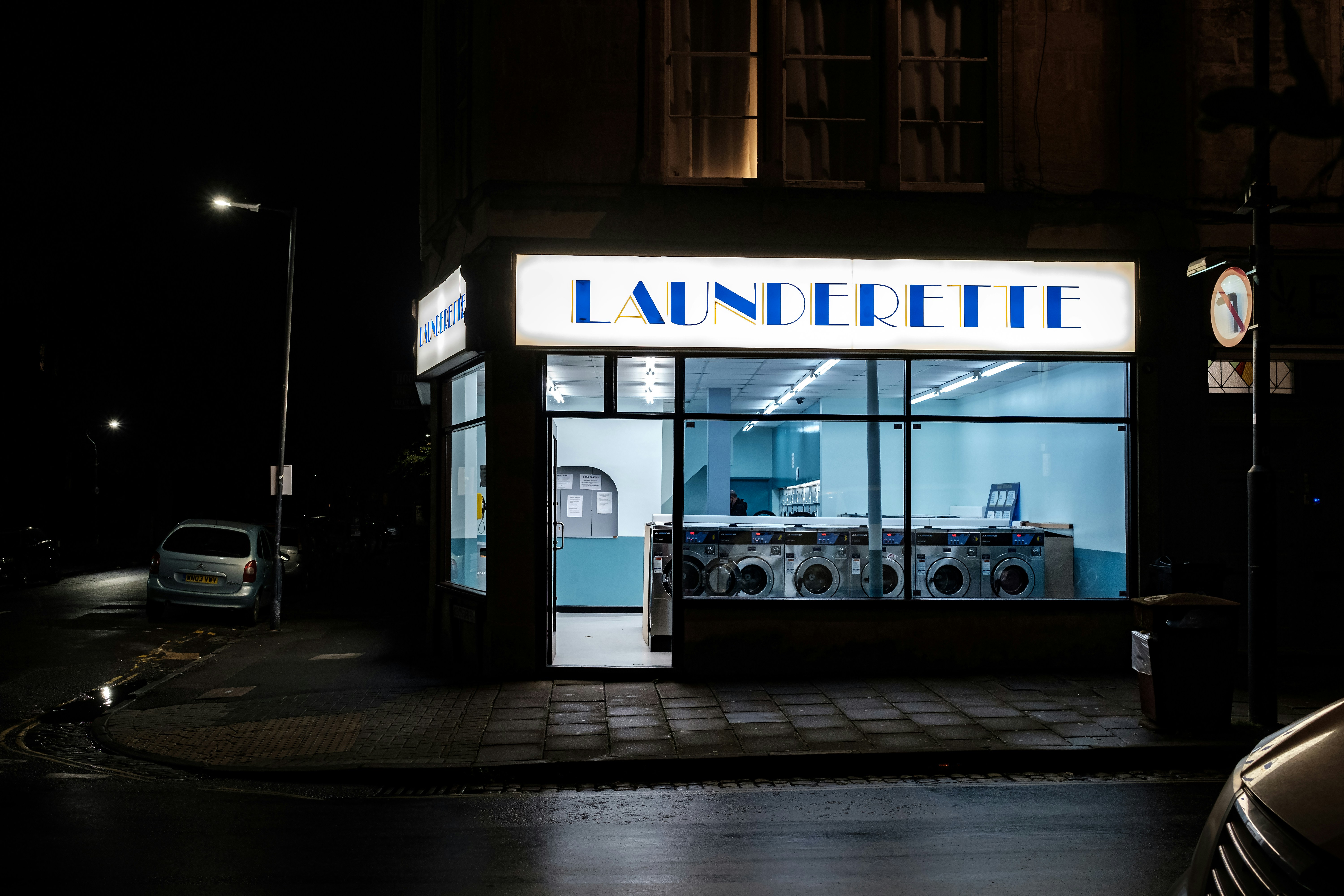 Local launderette business at night time, lots of washing machines and tumble dryers. An empty store illuminated by fluorescent light in Bristol, UK. 1/5