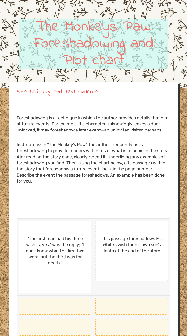 Plot - The monkey's paw is about a family that received a monkey's paw from an old friend. The monkeys paw had the ability to grant them three wishes. Sadly, in the end they face great consequence for their desired wishes. -- Character -- Character - Mr. White the protagonist of the story was selfish and didn't think things through. Comparing original stories to their film counterparts is a common practice that tends to provoke critical thinking and discussion. Explore an in-depth comparison of 'To Kill a Mockingbird' to its ... Description. After or while students read " The Monkey's Paw ", have them complete this plot diagram specifically made for the story. Reported resources will be reviewed by our team. Report this resource to let us know if this resource violates TpT’s content guidelines. The Monkey's Paw is a story about a mystical charm, a monkey's paw that is brought into the home of the White family by Sergeant Major Morris, who has served in India. The monkey's paw has the...