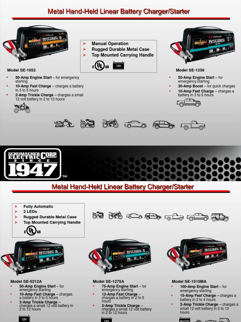 These files are related to Schumacher Battery Charger SE-5212A User Guide . Just preview or download the desired file. For 12v and 24v battery systems schumacher electric corporation... always operate battery charger in an open... h. dc wiring details.