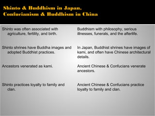 Taoism, Confucianism, Shinto lecture - SlideShare Buddhism with philosophy, serious illnesses, funerals, and the afterlife. In Japan, Buddhist shrines have images of kami, and often have Chinese architectural details. Ancient Chinese & Confucians venerate ancestors. Ancient Chinese & Confucians practice loyalty to family and clan. 55. Shinto, Taoism and Confucianism Diagram Handout #2 Venn Diagram