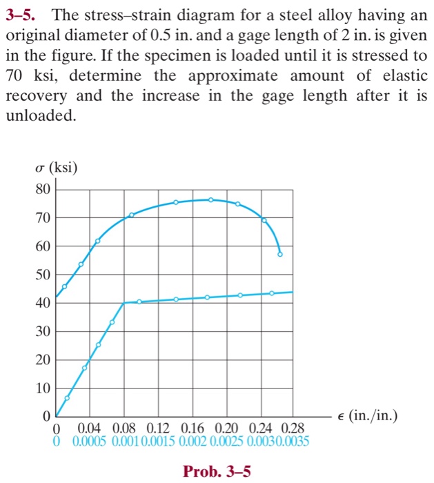 Solved The stress-strain diagram for a steel alloy having ... The stress-strain diagram for a steel alloy having an original diameter of 0.6 in and a gage length of 5 in. is shown in the figure below (Figure 1). The specimen is loaded until it is stressed to 70 ksi. Part A Determine the approximate amount of elastic recovery. Express your answer to three significant figures and include appropriate units.
