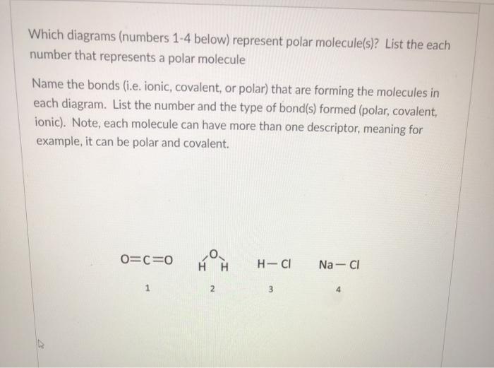 Which diagram best represents a polar molecule. Which Structure Represents A Nonpolar Molecule? Shapes Of ... You are watching: Which structure represents a nonpolar molecule? The better the electronegativity difference, the much more ionic the link is. Bonds the are partially ionic are called polar covalent bonds. Nonpolar covalent bonds, through equal share of the bond electrons, arise once the electronegativities of the 2 atoms room equal. PDF 4286 - 1 - Page 1 Name: ___ 11) Which structural formula represents a polar molecule? 1) 2) 3) 4) ___ 12) A diamond consists of covalently bonded carbon atoms. The diamond is an example of Which formula represents a polar molecule? - Quora Answer: To represent a polar compund first you need to know about polar bonds take two very contrasting elements one which has extreme affinity to gain a electron ( electropositive) and the other being having extreme abhor for electrons one who wants to donate electron ( electronegative) and you... PDF Manhasset Union Free School District / Homepage 13. Which formula represents a nonpolar molecule containing polar covalent bonds? 1. 1. 2. 14. 1 at is the chemical fonnula for lead(IV) oxide? b02 2. Pb04 3. Pb20 4. Pb40 15. In the formulaXS04, the symbol X could represent the element 16. 4. Na .ch compound has the strongest hydrogen bonding at STP? 2. 20 3. 4. H2Te 17.