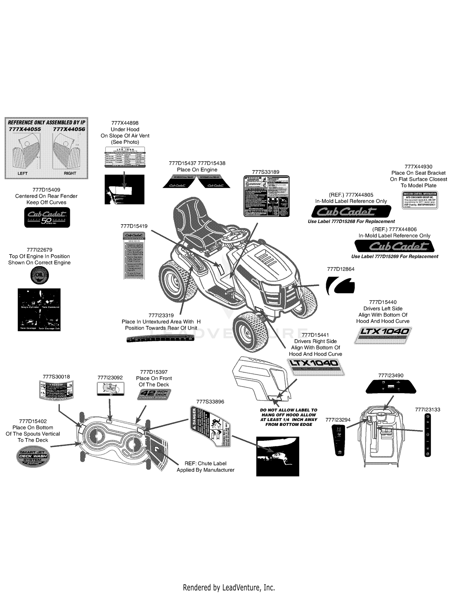 Cub Cadet Parts Diagrams, Cub Cadet LTX1040 Tractor (2009 ... Cub Cadet Parts Diagrams, Cub Cadet LTX1040 Tractor (2009) 13AX90AR009 13AX90AR010 13AX90AR056 13AX90AR256 13RX90AR056 13RX90AR256 .Quick Reference Attachment; Drive System. Frame, Battery & PTO. Hood & Dash Assembly. Kohler Engine Accessories. Kohler SV590-0220 Air Intake & Filtration ... Replacement Parts & Service | Cub Cadet CA Cub Cadet Genuine Parts gives you a genuine advantage: the confidence of using parts specifically designed for a exact fit, optimal performance and maximum safety. These are the only parts with the in-depth engineering and rigid testing that assures long-lasting quality. Use our parts diagram tool below to find the parts you need for your machine. Wiring Diagram For A Cub Cadet Ltx 1040 - The Wiring ... Through the thousands of pictures on the internet concerning cub cadet ltx 1045 parts diagram, we all picks the best series with greatest image resolution only for you, and now this photos is one of images libraries in our finest images gallery regarding Cub Cadet Ltx 1045 Parts Diagram.Lets hope you can as it. This particular photograph (Wiring Diagram For A Cub Cadet Ltx 1040 - The Wiring ... LT 1040 (13AX10CG710) - Cub Cadet 42" Lawn Tractor Parts ... Repair parts and diagrams for LT 1040 (13AX10CG710) - Cub Cadet 42" Lawn Tractor. The Right Parts, Shipped Fast! ... LT 1040 (13AX10CG710) - Cub Cadet 42" Lawn Tractor > Parts Diagrams (35) Hide .Quick Reference. Command Engine - Air Intake & Exhaust. Command Engine - Blower Housing.