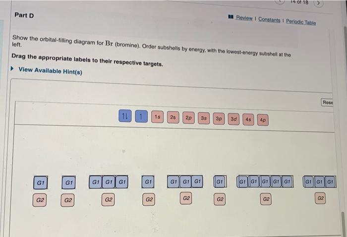 Solved Part D Show the orbital-filling diagram for Br | Chegg.com Transcribed image text : Part D Show the orbital-filling diagram for Br (bromine). Order subshells by energy, with the lowest-energy subshell at the left. View Available Hint(s) Reset Help 1 18 25 2p 3s 3p 30 48 4p Submit Provide Feedback Next > Part B Show the orbital-filling diagram for N (nitrogen).