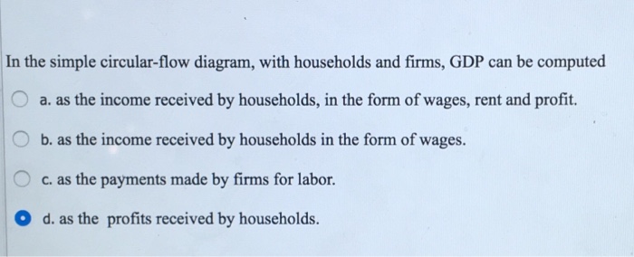 Circular Flow of Income Diagram - Economics Help The Circular flow of income diagram models what happens in a very basic economy. In the very basic model, we have two principal components of the economy: Firms. Companies who pay wages to workers and produce output. Households. Individuals who consume goods and receive wages from firms. Solved According to the circular-flow diagram, GDP - Chegg According to the circular-flow diagram, GDP a. can be computed as payments firms make to factors of production plus revenues they receive from the sales of goods and services.