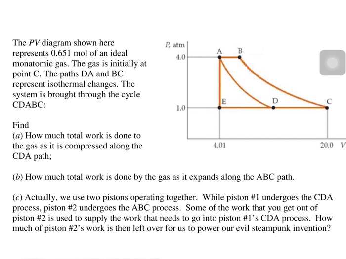 What are PV diagrams? (article) - Khan Academy Let's say our gas starts out in the state shown in the PV diagram below. If we press the piston downward, the volume of the gas will decrease, so the state must shift to the left toward smaller volumes (as seen in the diagram below). Since the gas is being compressed we can also say for sure that positive work is being done on the gas.