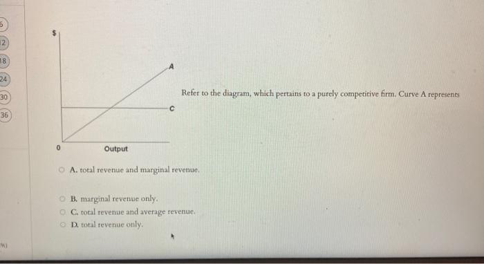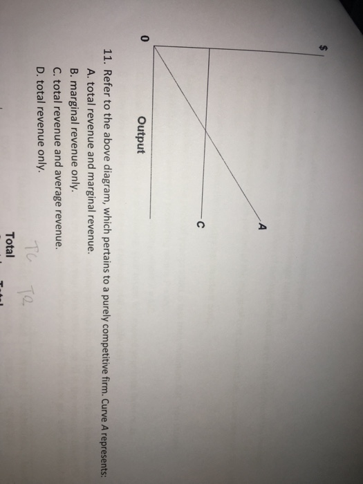 Solved 0 Output 11. Refer to the above diagram, which ... The answer is D-) Total revenue only. Beca …. View the full answer. Transcribed image text: 0 Output 11. Refer to the above diagram, which pertains to a purely competitive firm. Curve A represents A. total revenue and marginal revenue. B. marginal revenue only. C. total revenue and average revenue D. total revenue only. TC Total.