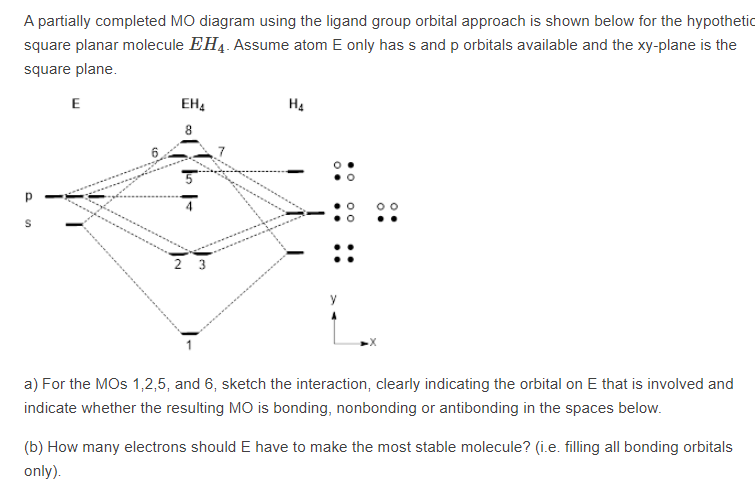 Molecular Orbitals of Square-Planar Tetrahydrides | VIPEr This in-class activity walks students through the preparation of a molecular-orbital diagram for methane in a square-planar environment. The students generate ligand-group orbitals (LGOs) for the set of 4 H(1s) orbitals and then interact these with carbon, ultimately finding that such a geometry is strongly disfavored because it does not maximize H/C bonding and leaves a lone pair on C. Ch4 Molecular Orbital Diagram - Wiring Diagrams As can be seen from the energy diagram - four of the molecular orbitals. Generate the Molecular Orbitals for CH4 (Td), CH4 (D4h) and Cyclopropane using diagram between the bonding MOs of square planar and tetrahedral CH4. The molecular orbital description of bonding in methane does several things for us. D-orbital splitting diagrams - Berkeley D-orbital splitting diagrams Use crystal field theory to generate splitting diagrams of the d-orbitals for metal complexes with the following coordination patterns: 1. Octahedral 2. Tetrahedral 3. Trigonal bipyramidal 4. Square pyramidal d z2x2-y d xy d yzxz 5. Square planar d z2x2-y d xy d yzxz d z2 d x2-yxy d yz d xz d z2 d x2-y2 d xy d yz d ...
