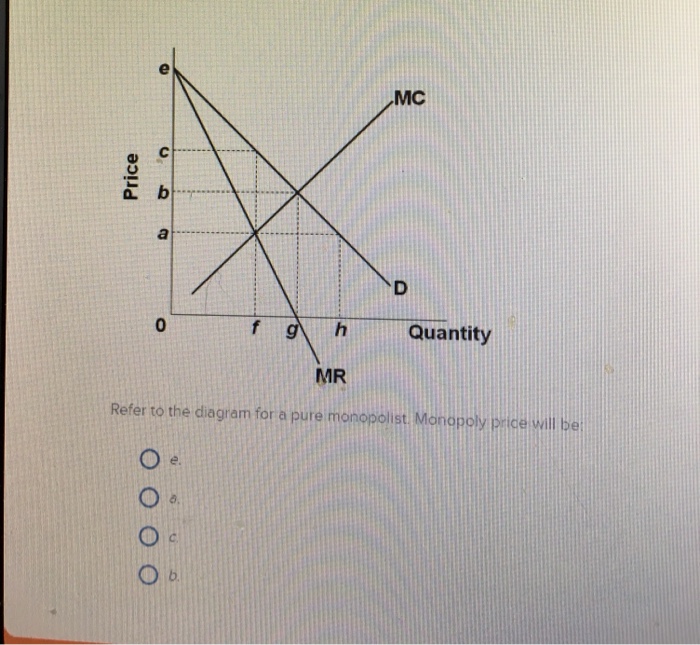 Micro Final Flashcards - Quizlet Refer to the diagram for a pure monopolist. Monopoly price will be A) c. B) a. C) e. D) b. A Refer to the diagram for a pure monopolist. Monopoly output will be A) f. C) g. B) between f and g. D) h. A A pure monopolist is generally viewed as A) both productively and allocatively inefficient. B) productively inefficient but allocatively efficient.
